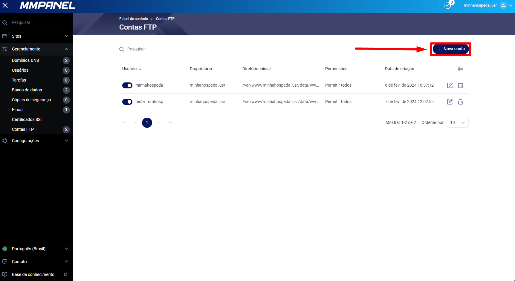 Para criar uma conta FTP vá para "Gerenciamento" → "Contas FTP"